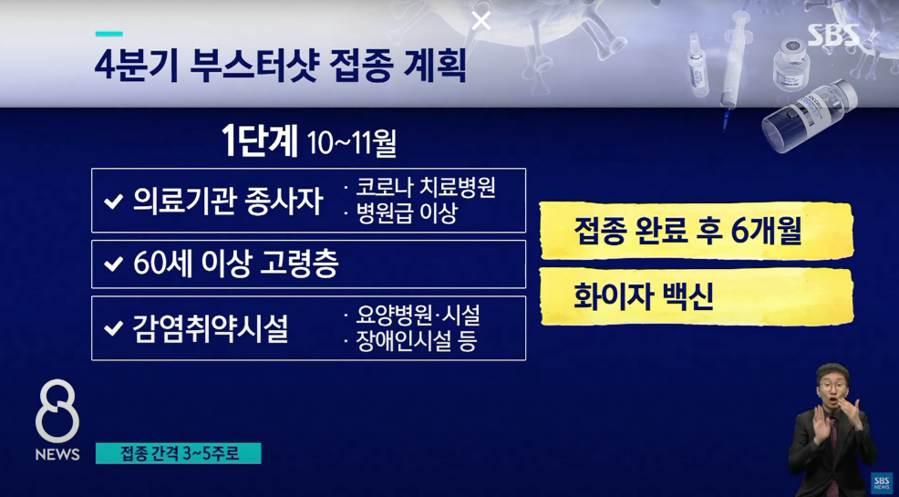 접종 대상은 접종완료 후 6개월이 지난 만 60세 이상 고령층 등 고위험군이 대상이며, 실제 접종은 오는 25일부터 전국 위탁의료기관에서 화이자 또는 모더나 백신으로 이루어지게 됩니다.