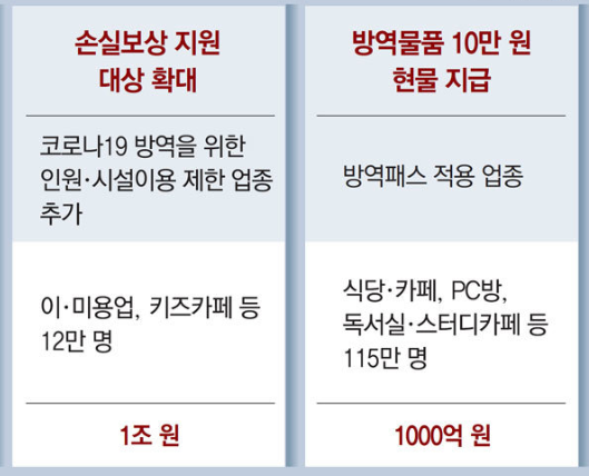 이에 따라 정부는 비상회의를 거쳐 소상공인을 대상으로한 소상공인 지원대책 3종 패키지로 방역지원금 지급, 손실보상 대상확대, 방역 물품구입비지원 대책을 발표하였습니다.